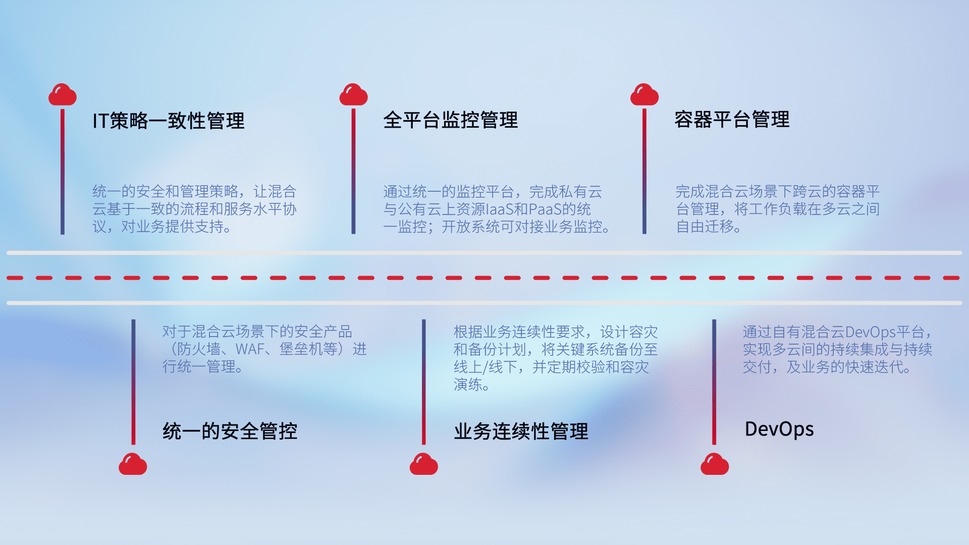 通过多云纳管,,,,以统一的资源数据模型把客户的云资源进行抽象和封装,,进而实现对多云资源的统一操作,,,,保障云资源管理的可靠性、、稳定性与可用性。。。。量身定制化运维内容,,,,配置、、、、开发运维、、补丁管理、、备份、、、监控、、、认证和访问管理、、审计和日常巡检等,,,,保障在用云过程中的可靠度,,稳定度以及高可用率。。