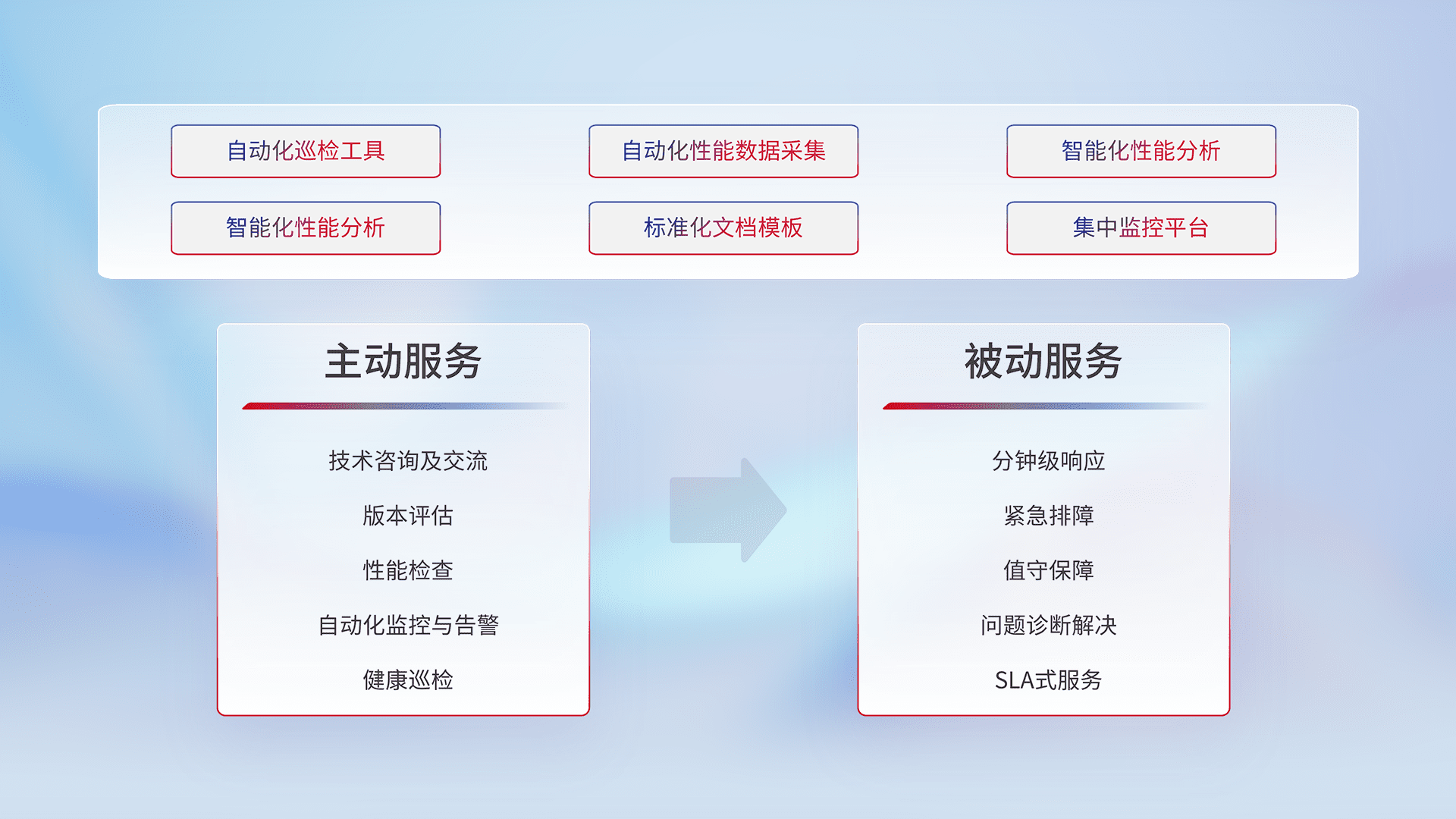 智能化工具和标准化文档,,保障服务质量,,,,提供主动服务(包含技术咨询、、、、版本评估、、、、性能检查、、、、自动化监控与告警、、健康巡检)和被动服务包含(分钟级响应、、紧急排障、、、、值守保障、、问题诊断解决、、、、SLA服务)。。。。